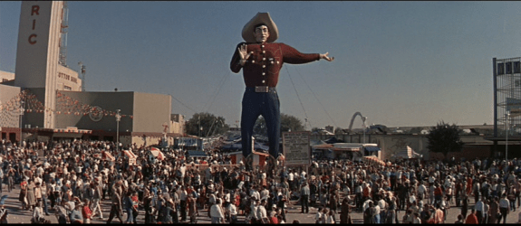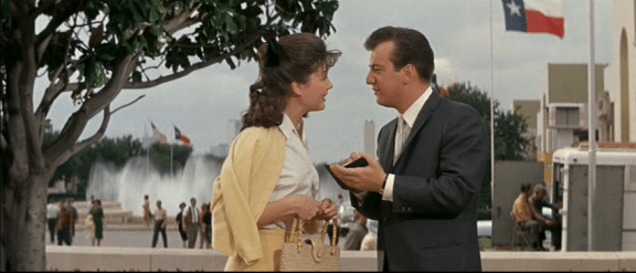 Margy makes a beeline for the midway and the exhibits, where a giant cowboy statue makes pronouncements in a loud, booming voice. Naturally, the fair is being covered by the local TV stations, with dreamboat Jerry Dundee (Bobby Darin) at the center doing step-up interviews. Jerry casts his eye on Margy, and it’s creepy because he’s a classic masher. In spite of herself, Margy is smitten.