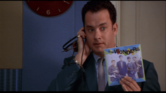 Soon a big-time producer, Mr. White (Tom Hanks) wants to buy out their contract and take the band on tour with the prestigious Play-Tone Galaxy. Only first he’s going to make a few changes. Faye can only go on tour if she’s their costume mistress. The guys have to wear nice suits because they’re nice boys. Well, all except for Guy, to whom Mr. White tosses a pair of shiny Foster Grants. And no more homophones. From now on, the group is called The Wonders.