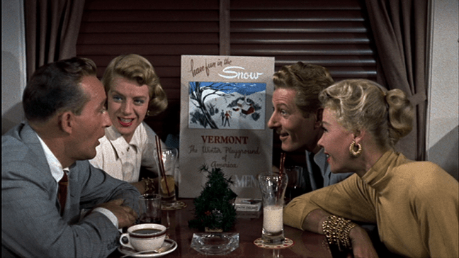 One night they go see a sister act, Betty and Judy Haines (Rosemary Clooney and Vera-Ellen), supposedly as a favor to an old pal from the Army. After helping the ladies out of a jam, Phil wheedles Bob into following Judy and Betty to Vermont, where they’ll be performing at an inn over the holidays. Their current show is on vacation anyway, and Vermont is supposed to be America’s snow playground.