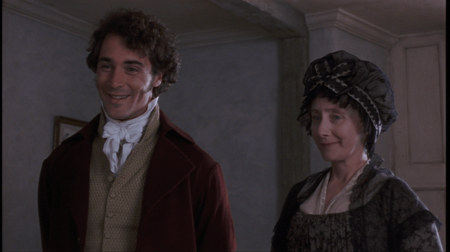 Not everyone takes John’s deathbed promise seriously. Fanny, a vinegary, selfish woman, talks John out of giving the Dashwoods money, so these poor women will have to make do on five hundred pounds a year. The next thing for them is to find a suitable house and move out. It takes some doing, but the Dashwoods finally rent a cottage in Dover on the estate of Sir John Middleton (Robert Hardy), who lives with his widowed mother-in-law, Mrs. Jennings (Elizabeth Spriggs). The rent is low and they have an automatic set of new friends, since Sir John and Mrs. Jennings wouldn’t dream of their neighbors being lonely.