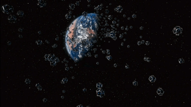 Transmorphers can be summed up in one word: Padding. Fully two minutes of the film are taken up by watching those alien robots float by in dodecahedron form. Slowly. And they keep floating. Past Saturn, past various generic astrological activities, and all in a neat little alien line. We spend what feels like a full minute just watching them float by Saturn and on down to Earth. It’s the Particle Parade That Never Ends.