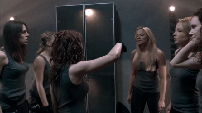 After poking around on the group’s captured robot for a while, Dr. Moby is able to draw no conclusions because their tent is set up smack in the middle of the battlefield which, oh yeah, is dangerous. The humans have to watch out for the robots’ random brain scans, a literal headache and not much else. Persevere they do, though, with the help of nuclear weapons that look like Frisbees. And the team has an air force populated by gorgeous women who look like they’ve all stepped out of the same Barbie box, led by the breathy-voiced, piercingly blue-eyed Xandria Lux (Shaley Scott), whose name is not at all porn star-ish.