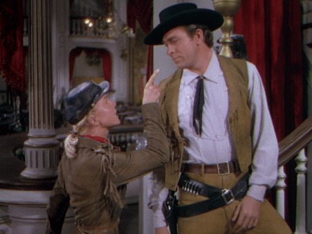 Calam high-tails it to Chicago, where she finds who she thinks is Adelaid Adams and brings her back to Dakota City, but, long story short, it’s really Adelaid’s maid, Katie Brown (Allyn Ann McLerie). The real Adelaid went to Europe after her engagement ended in Chicago and left Katie all her costumes. It’s an honest mistake, but Calam has to talk fast. Give Katie a chance, she says. It works; Katie becomes a star among the Deadwood crowd.