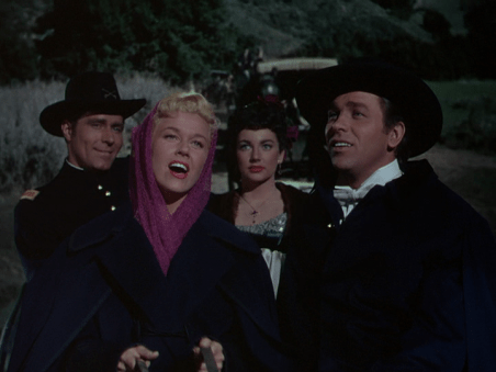The movie opens with Calamity Jane (Doris Day), riding into Deadwood City, South Dakota on the stagecoach. She’s kind of a star around those parts, because she can outride, outshoot, and outrope any man in town. Her voice is a lusty mix of Ethel Merman and Marjorie Main. She’s one of the guys. Wild Bill Hickok (Howard Keel) is her best friend and Lieutenant Danny Gilmartin (Philip Carey) is the guy she’s stuck on, except that he doesn’t think of her as a woman.