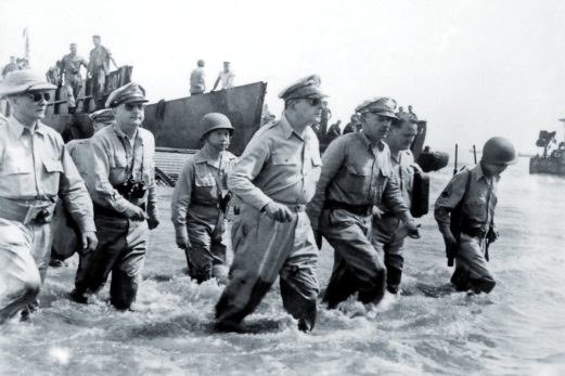 One of the Second World War’s most iconic images is that of General Douglas MacArthur wading through the surf at Leyte in his long-promised return to the Philippines. While that incident has famously been called “staged,” it was and it wasn’t. MacArthur’s landing craft was unable to take him right up to the beach because the water was too shallow, so MacArthur and his entourage were basically dumped fifty yards from shore. A quick-thinking Army photographer snapped the angry MacArthur as he slogged through the water, ticking the general off even more.
