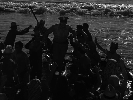 This might be hindsight talking, but Back To Bataan seems cobbled together. While it’s supposed to be about the guerrilla fighters working against the Japanese invaders, there’s a lot of footage of these characters hiking through jungle or sailing on a schooner across some bay or river or other. They look exhausted. They look homeless. And they look resolute. We just don’t see them really do much. By and large, they’re biding their time until the Colonel comes back, which he does in a less-than-dramatic send-up of MacArthur’s famous landing: Madden touches down right on the beach, looking clean-shaven and rested like a star should. He gets a hero’s welcome from his troops, and that’s when things really start happening.