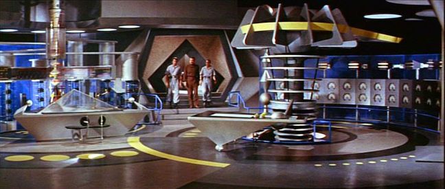 Something that probably jumps out at John Christopher fans are the triangle-shaped doors, because anyone who has read The City of Gold and Lead can attest, the Tripods needed pointy doors to accommodate their unusual physiologies. Odds are good Christopher was at least a little inspired by Forbidden Planet.
