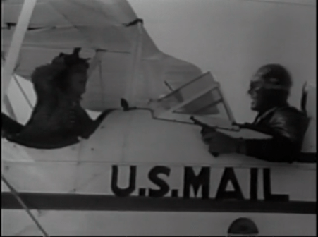 While all this intrigue is happening, Eric (Bruce Bennett, credited as Herman Brix) has been given an assignment by the FBI to find out why mail planes have been disappearing, and he’s been told to fly around in a mail plane as a decoy. Guess how he and Marion meet? Yep. She pops up after he’s taken off and her only explanation is that she doesn’t want to get married. Eric is annoyed but seems to buy it.