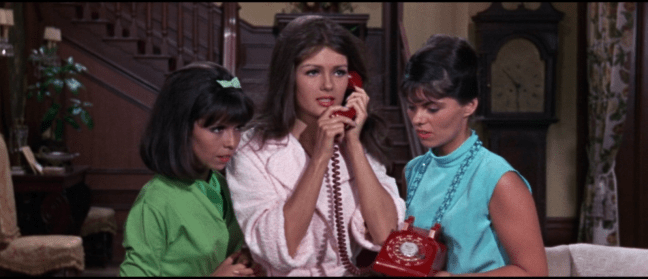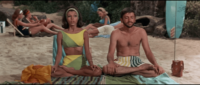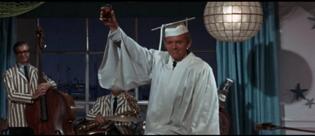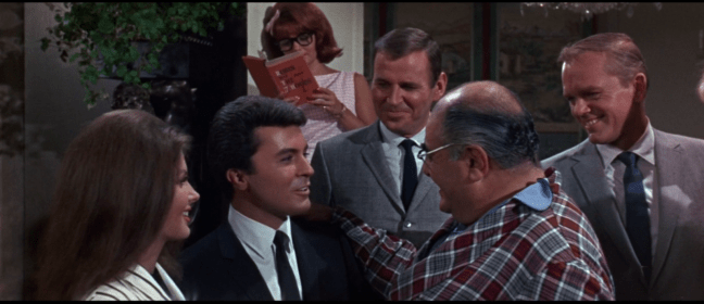 Gardner Pruit III (James Darren), or Ding-a-ling, as he’s more fondly known, really wants a date with Sandy Palmer (Pamela Tiffin), and he won’t take no for an answer. He’s so important he has his assistant and best friend, Kelp (Bob Denver) make the call for him on one of his two car phones. After she hangs up on him, Ding sneaks into Sandy’s sorority house, hiding behind his surfboard.
