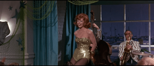 Sandy’s uncle, Woody Woodbury (Playing himself) and his show biz partner, Sid (Paul Lynne) are part of the entertainment at the Silver Palms. Well, “entertainment” is incorrect. Woody and Sid are the guys who bore the audience while everyone waits to see the real star attraction, dancer Topaz (Tina Louise).