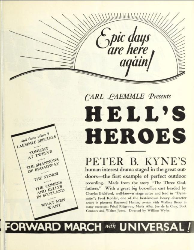 The film was a huge success, pulling in a respectable seventy-seven million dollars in today’s money, and none of the reviews had anything really negative to say about it. In fact, the reviews were downright gushy, using such adjectives as “powerful drama,” “the most impressive picture,” and “the hardest-hitting talkie.” The January 25, 1930 edition of Universal Weekly said, “If we are to have talkies then by all means let us have good ones. “Hell’s Heroes” is one of the very few good ones we have seen, since this new medium has been devised.”