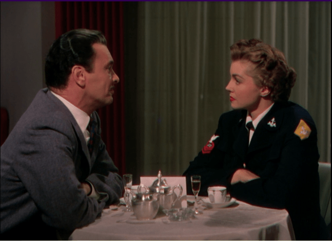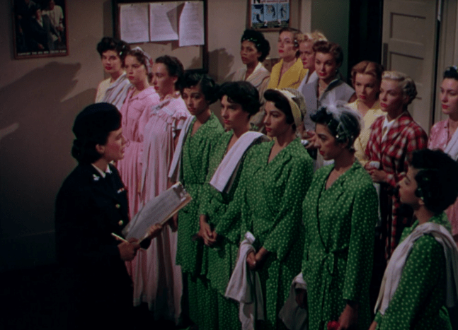 It’s not perfect, of course. One misstep happens when Whitney signs up as a non-swimmer so she can stay with her friends, and the instructor notices pretty quickly that she’s a champion swimmer. Another happens when Whitney gets in a scuffle with three WACs who flirt with her dinner date, an intriguing fellow, who, awkwardly enough, turns out to be Lieutenant Commander Paul Elcott (Barry Anderson), the base doctor. Mary Kate is homesick until her runaway groom, Dick (Keefe Brasselle) shows up and basically says Mary Kate isn’t tough enough to make it in the Navy.