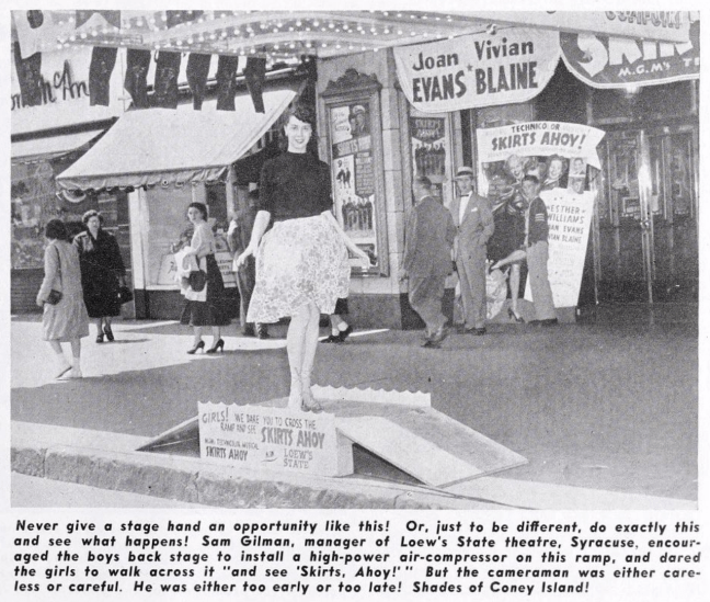 Syracuse, New York seemed to top them all. Theater engineer Jack Dorian of the Loew’s State Theater rigged a special ramp for all the women who saw Skirts Ahoy! to walk over on their way into the theater, and theoretically, a small fan would blow their skirts around. It was all in fun, of course, and it was all five years before a certain scene in a certain Marilyn Monroe movie that we all know.
