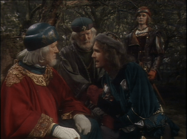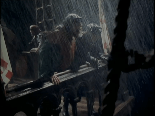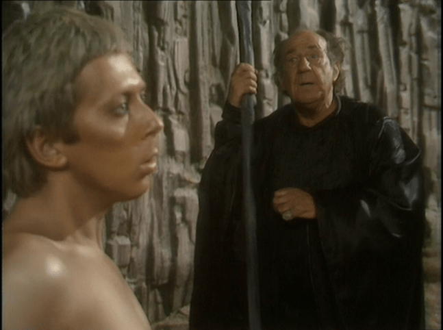 It opens during a blinding storm, with Alonso (David Waller) the king of Naples, Antonio (Derek Godfrey) the Duke of Naples and Alonso’s men battling it out. Fortunately, they’re close to an island, which, funnily enough, is where Antonio’s brother, Prospero (Michael Hordern) and his daughter, Miranda (Pippa Guard), fled to with a minimum of creature comforts after Antonio usurped Prospero.