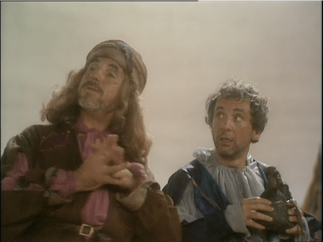 There is a wrinkle in the plan, however. The nobles who are with Alonso, including Antonio, are conspiring to assassinate Alonso, and Prospero tells Ariel to break it up. Ariel comes through mightily, with an army of goblins. who chase Antonio and everyone away, including two nobles named Trinculo (Andrew Sachs) and Stephano (Nigel Hawthorne), the group’s resident Abbott and Costello, who run off with Calabrian.