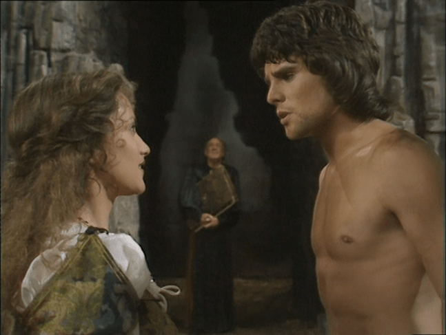 While Miranda snoozes, Prospero plots. He knows that Alonso and his men have been shipwrecked, and he engages Ariel (David Dixon), a spirit on the island, to basically torment Alonso and Company as kind of revenge for Antonio grabbing the dukedom. There’s also an extremely hairy fellow named Calabrian (Warren Clarke) who Prospero sends off to meet the castaways and protect he and Miranda.