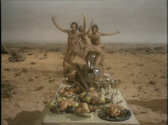 As the film went on, things got more and more ludicrous, particularly in the scene with the banquet table. As soon as they set the table down, these guys, who, again, are all wearing teeny G-strings, start cavorting around like a sprite Bacchanal while Alonso and his men stand off to the side, looking way more non-plussed than they should have. What would any of us say if a bunch of scantily-clad men appeared out of nowhere with a banquet board, danced around it, and then carried it away without so much as a “Fancy a doggy bag?”