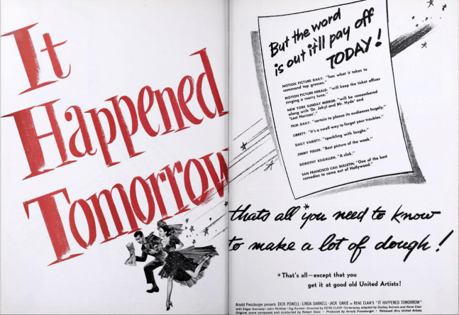 While there might not have been any wins, the reviews were healthy shades of complimentary. Motion Picture Herald said It Happened Tomorrow is “farce straight through, satiric at times and frankly slapstick on occasion but it is uncommonly gay with surprises that should keep the chuckles coming and the ticket offices singing a merry tune.”