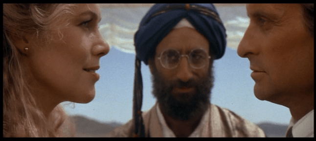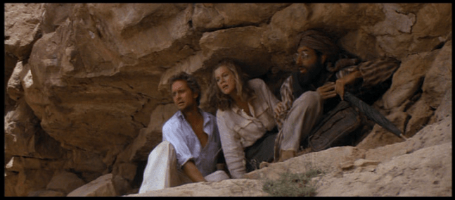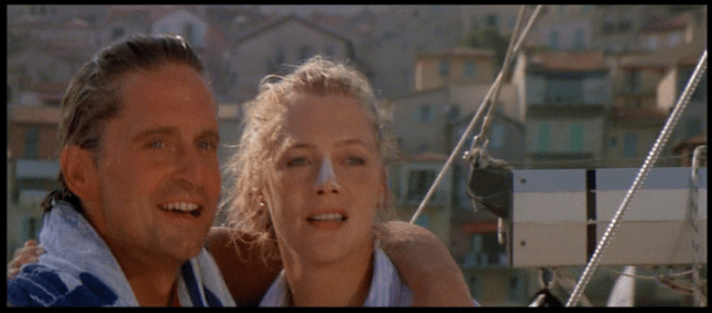 In the real world, Jack (Michael Douglas) and Joan (Kathleen Turner) are in Cannes, with Joan on the deck of the sailboat working on her latest novel while Jack windsurfs around the boat. Joan is frustrated. She’s got writer’s block. She wants a little bit of stability and normalcy after six months of sailing. And her relationship with Jack doesn’t seem to be going anywhere serious.