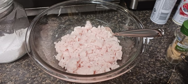 The first thing, of course, was to grind the fish, and I had some nice rockfish fillets from Winco. I know Julia said to use a white fish, but the rockfish was the best price. Unfortunately, I was too busy pulling out the bones to take a picture.