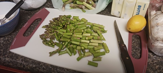 Ze poisson went into the réfrigérateur while I prepped the asparagus. Julia suggests using frozen asparagus if it’s out of season, but since we’re currently smack dab in the middle of summer, fresh was no problem.