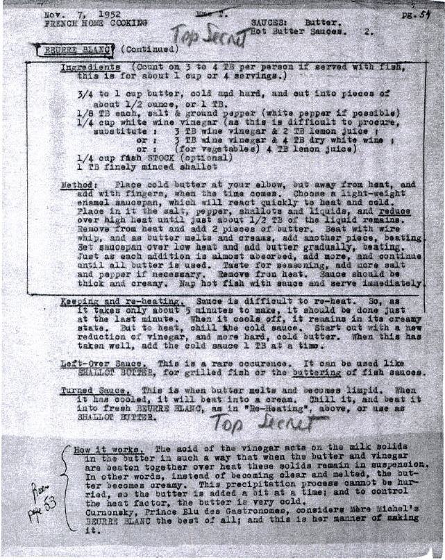 This is a pretty prestigious recipe in Julia’s repertoire, and until Mastering the Art of French Cooking, was a closely guarded secret. As Julia said herself on several occasions, she talked famous Parisien restauranteur La Mère Michel, who popularized buerre blanc in Paris, into showing her how to make the decadent topping. The great lady was happy to do so, and Julia rushed home to try it for herself and then write it down. Just to be safe, she sent a copy to her sister.