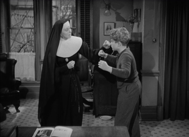 The St. Mary’s nuns aren’t burdened by any such strictures; Sister Benedict is free to show one student how to swing a baseball bat and another how to box. This portrayal mystified the famous Bosley Crowther, who called it “incongruous.”