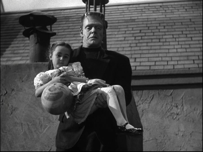 When Ygor and the monster reach Visaria, the monster helps a little girl, Cloestein Hussman (Janet Ann Gallow) retrieve her ball from the top of a roof. The villagers are aghast, of course, Cloestein’s dad, Herr Hussman (Olaf Hytten) in particular, especially once the monster knocks a few villagers down the stairs. Once they see what’s going on, everyone relaxes just slightly, but the monster only comes down after the villagers promise not to hurt him.