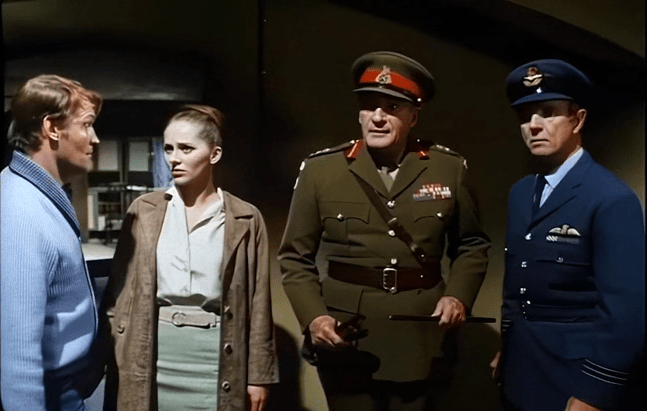 Bob is a player, and he’s fine with leaving his very blonde pilot girlfriend to come to the base, where he makes contact with Dr. Matthews (Maurice Evans) and lab tech Julie Slade (Hilary Heath), who are also on the case. They’ve found one of the victims, and Julie’s able to determine that the tissue samples taken from the body have been changed by whatever zapped him. How have they changed? We don’t know, because the movie doesn’t tell us or show us anything.