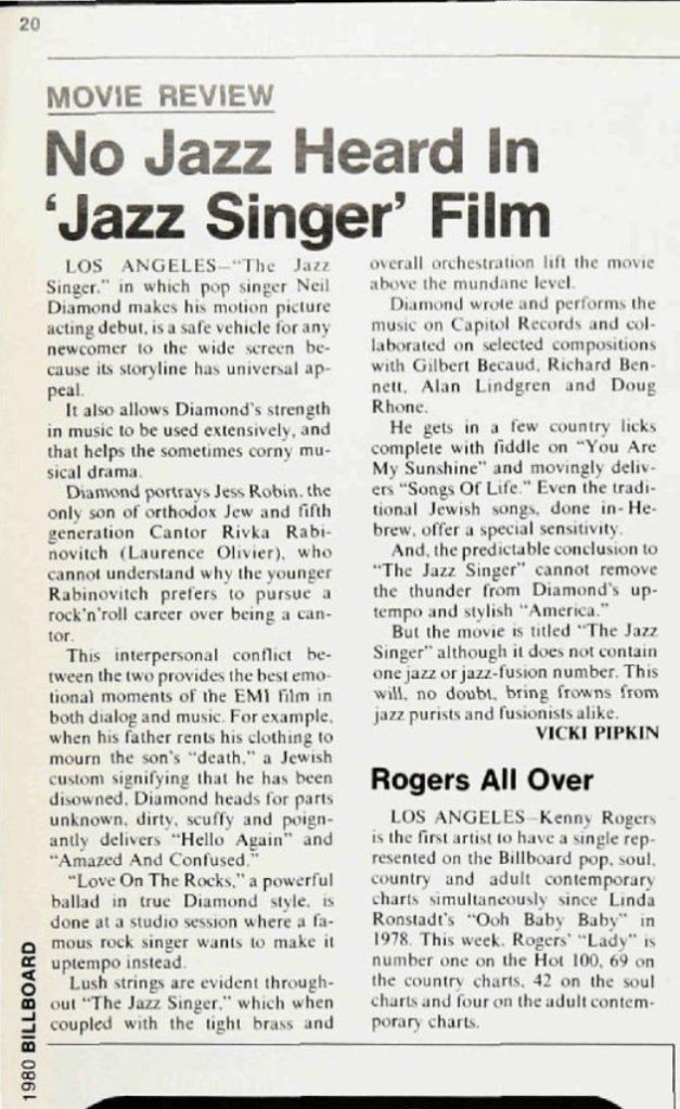 Speaking of Jolson, one of the biggest complaints about the 1980 Jazz Singer is the antiquated story and Diamond’s advanced age making him too old to be a young cantor dissatisfied with his life. Diamond was thirty-nine when The Jazz Singer was released. Funnily enough, Al Jolson, for all his Jazz Singer is a landmark achievement, was also thirty-nine when it was released, Heck, Danny Thomas was forty when his version of The Jazz Singer came out, so age isn’t really the issue, although it stretches the cred a little.
